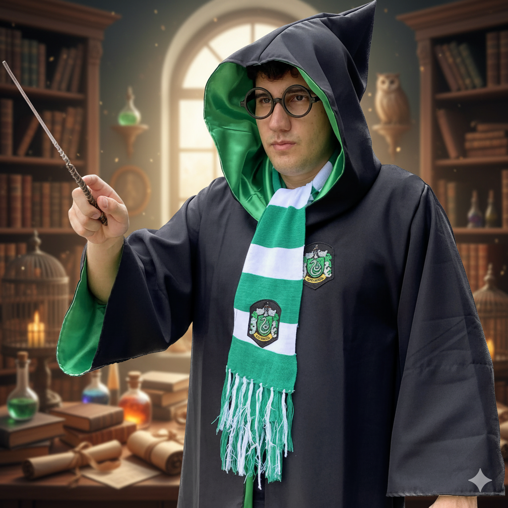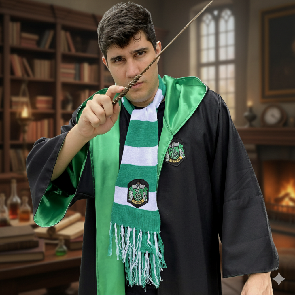 Vista-se como um verdadeiro aluno da casa Sonserina com essa fantasia completa inspirada no universo Harry Potter!